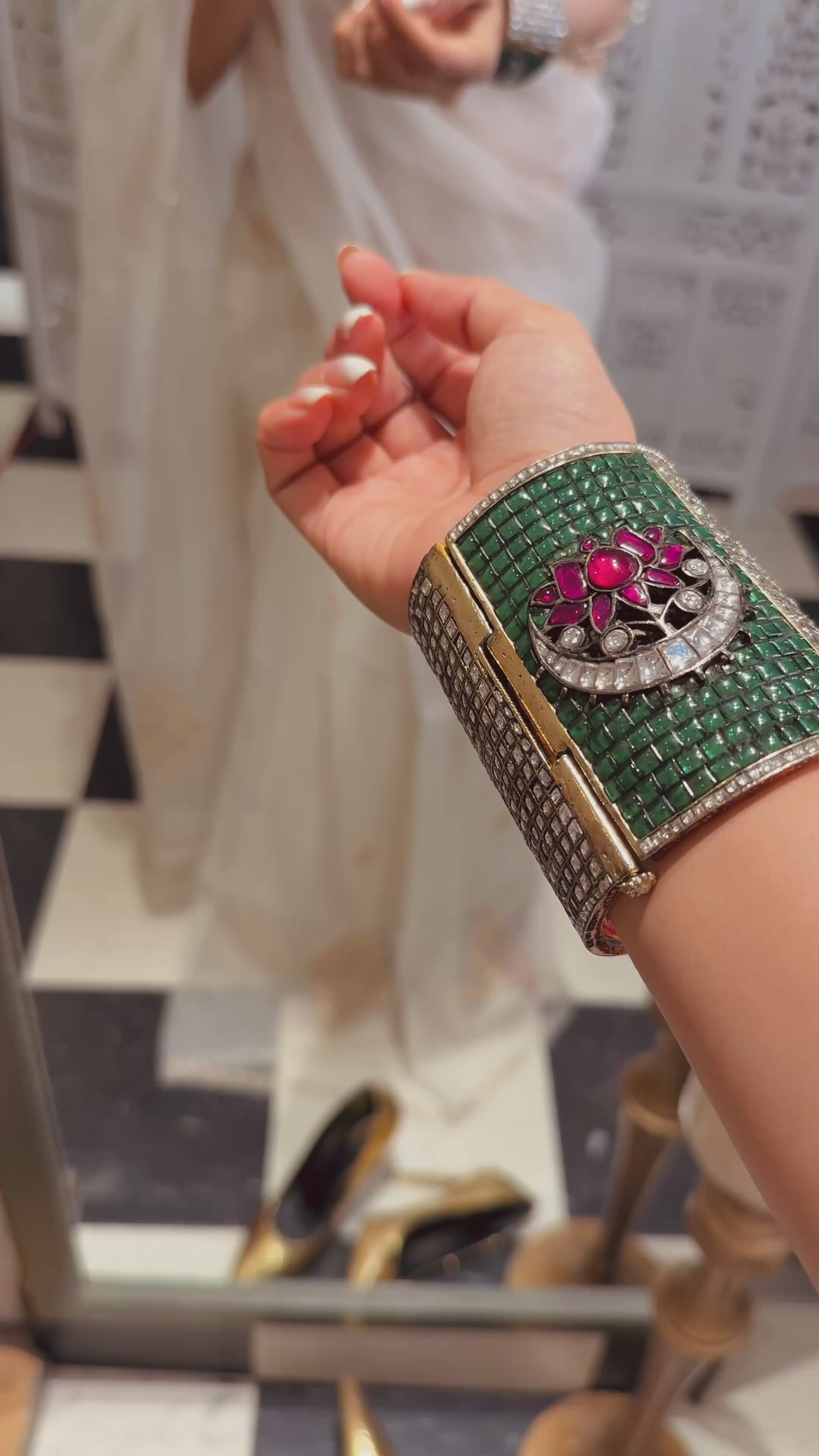The edges of the cuff are framed with rows of brilliant small polkis, adding a touch of luminosity that beautifully complements the richness of green and crimson hues. The wide, bold silhouette makes it a true statement piece — both majestic and contemporary, ideal for grand celebrations or heirloom-style luxury looks.