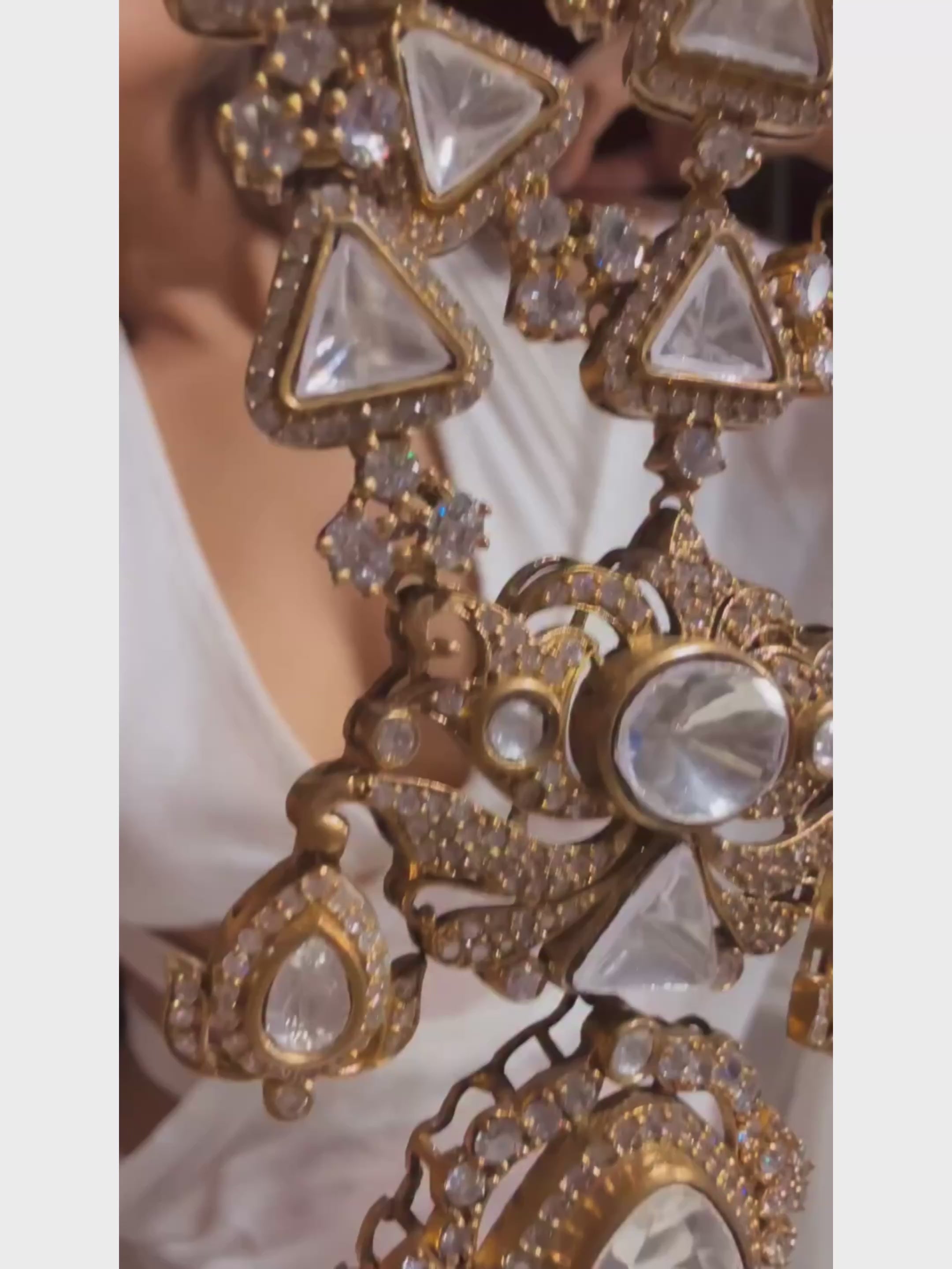 The necklace in the image is an opulent, statement piece crafted with intricate detailing. It is a layered design featuring multiple strands of triangular and round-cut stones set in a rich, gold-toned framework. The necklace is heavily embellished with shimmering white polki and zircons on it a regal and traditional Indian jewelry appeal.