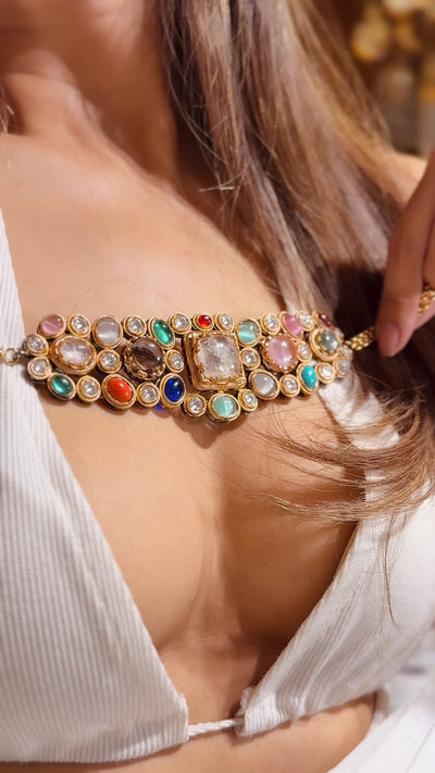 Composition : 22k antique gold plated silver alloy meticulously crafted with natural stones like labradorite green ,rose quartz, clear quartz , amber, pinky sapphire, blue Lapiz and black tourmaline.