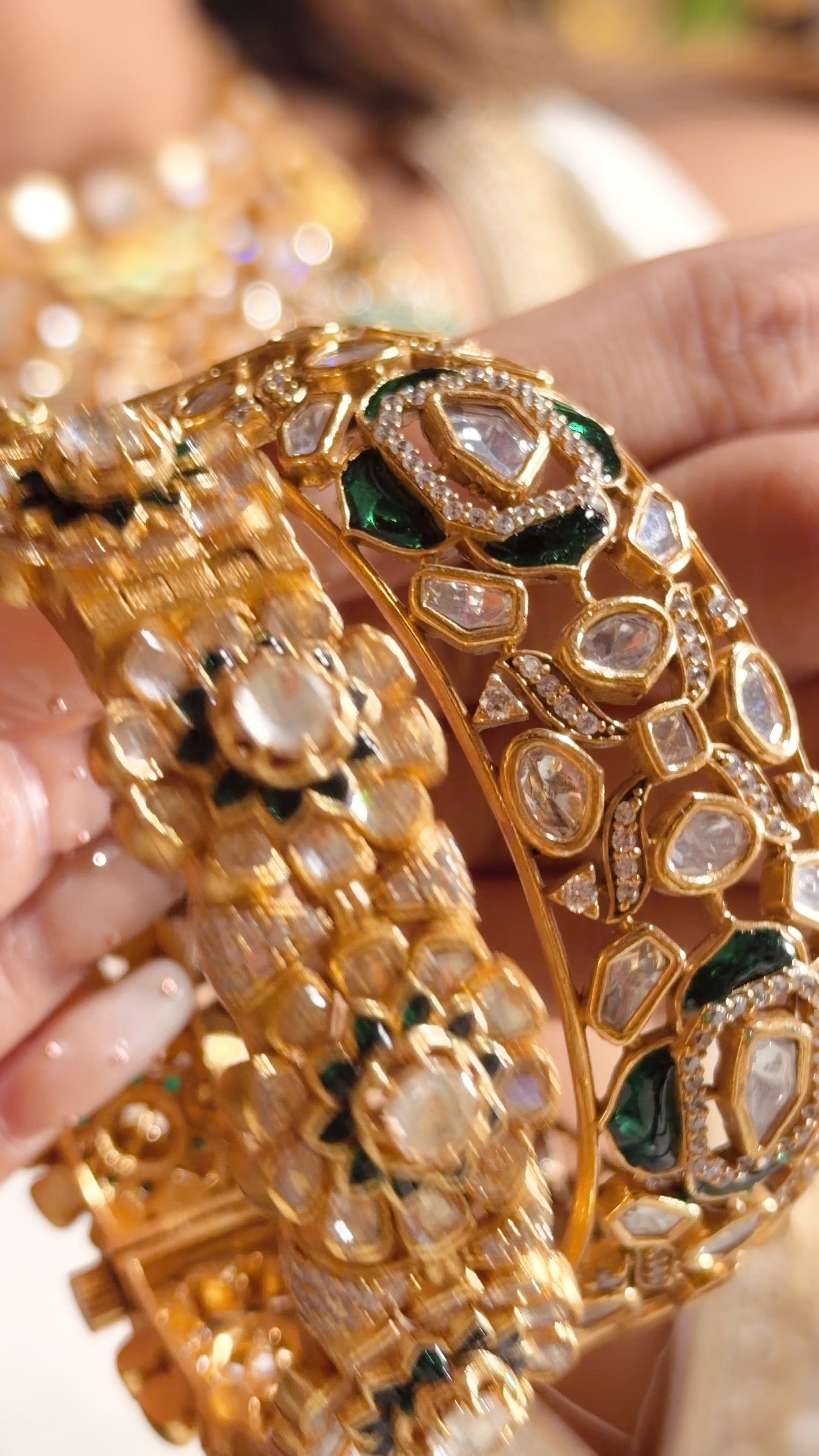 This bangle is a beautiful example of next-to-real heritage jewellery, crafted to mirror the richness of fine polki pieces.