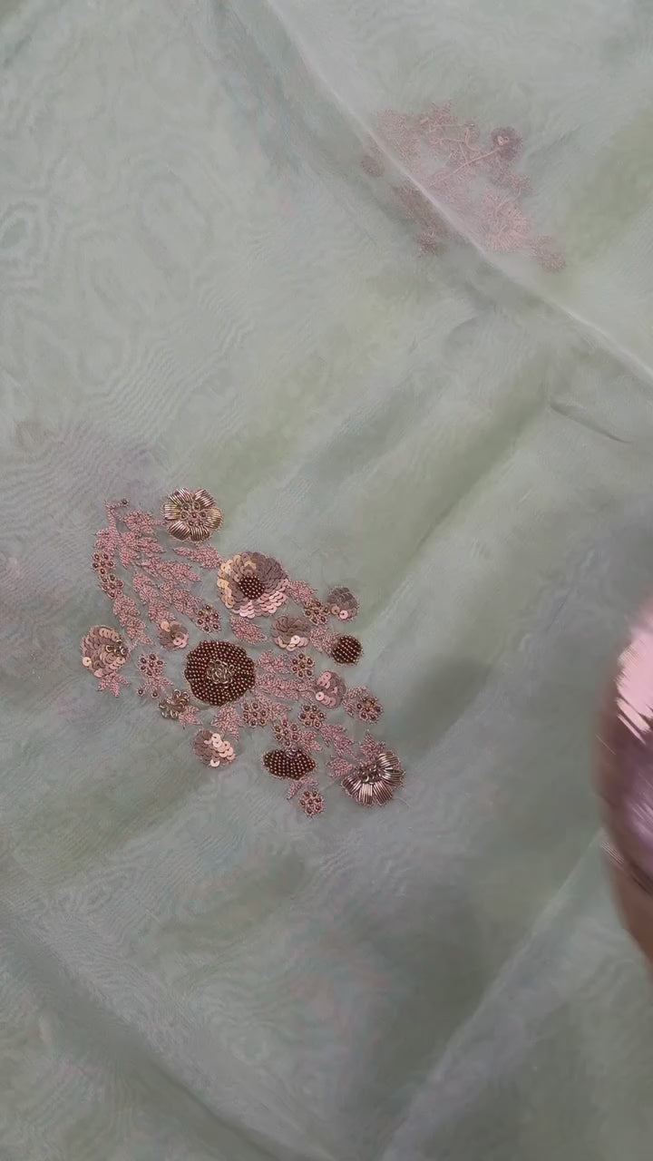 A delicate pastel green shade exuding an ethereal and graceful charm. It features elegant golden floral embroidery scattered across the fabric, adding a subtle shimmer and sophistication. The border is scalloped with a fine gold edge, which beautifully frames the saree and enhances its refined appeal.