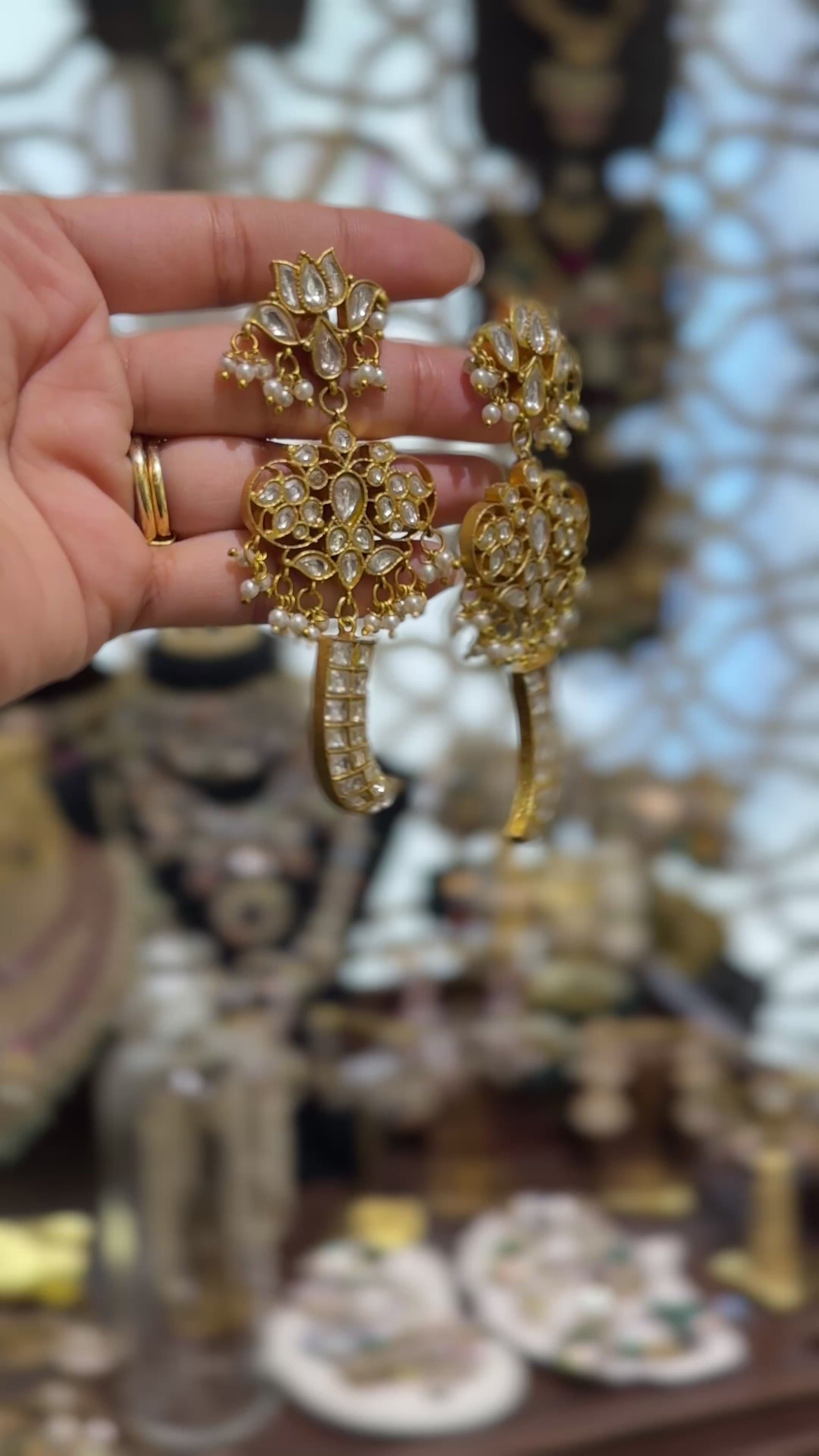 This earring is a regal lotus-inspired chandbali, exquisitely handcrafted in traditional kundan and polki work. The design begins with a blooming lotus motif on the top, set with pear-shaped uncut stones edged with delicate pearl droplets. Below it rests a wide floral cluster, intricately inlaid with polki stones arranged in a symmetrical pattern, further enhanced with dangling pearls for a touch of movement and grace.