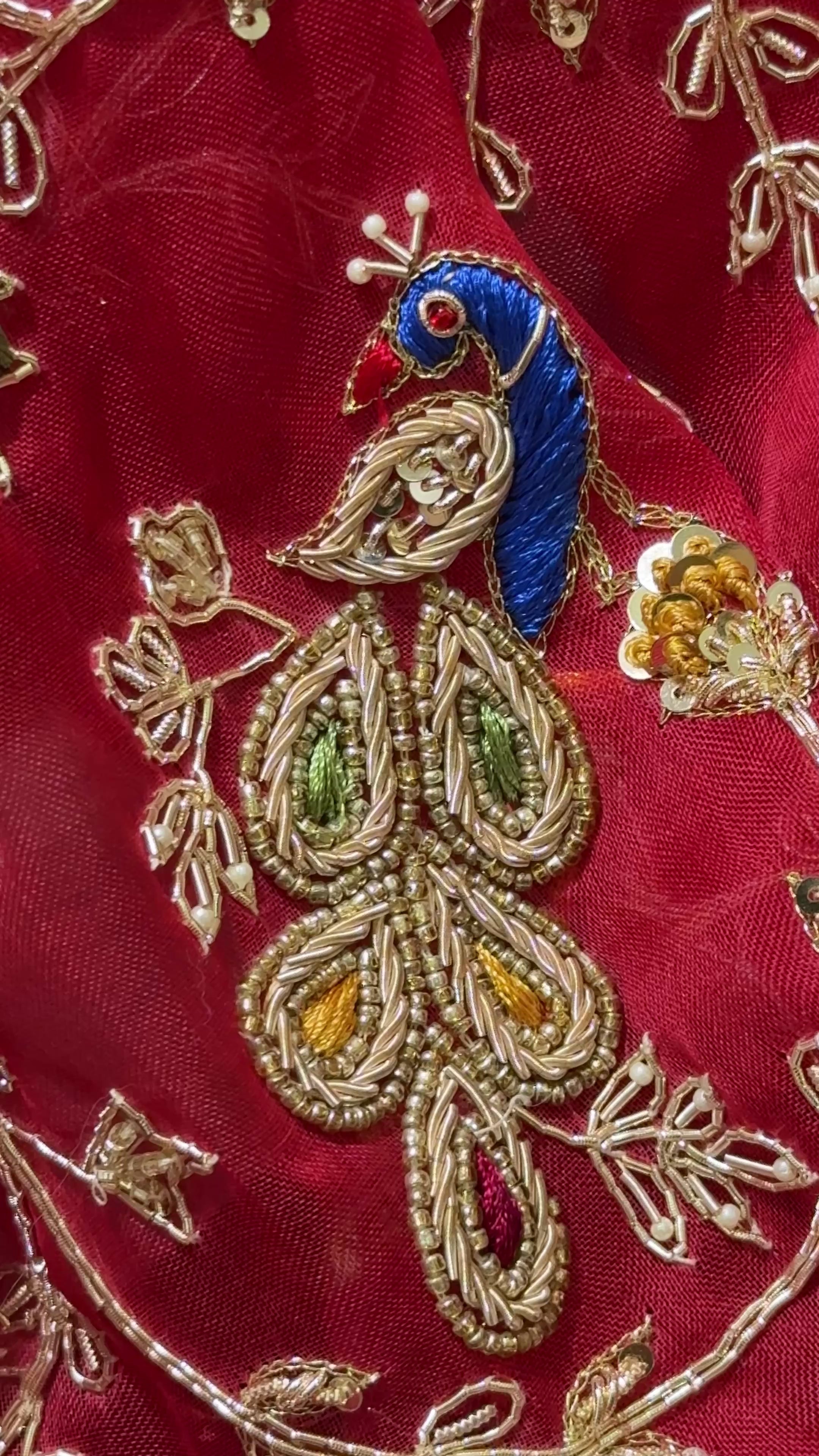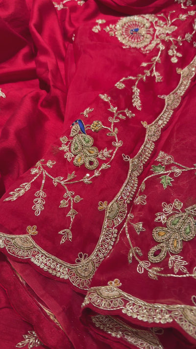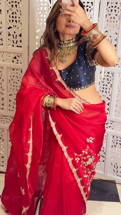 Includes : 5.5 metres of 6 yards elegance with unstitched Raw silk Blouse piece with heavy work front , Back & sleeves .