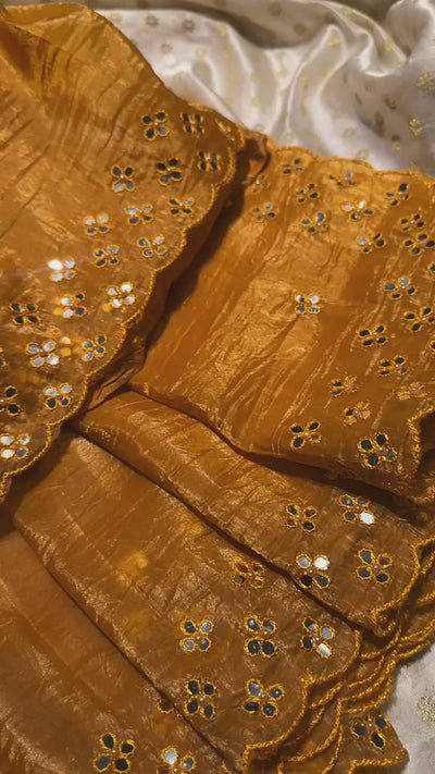 DEli ate soft light weight saree with subtle mirror embroidered along the border. The embroidery is dainty, giving it a very elegant and traditional touch. It is paired with a golden blouse that adds a beautiful contrast and richness to the overall look. The styling with statement gold and pearl jhumkas enhances its regal ethnic charm.